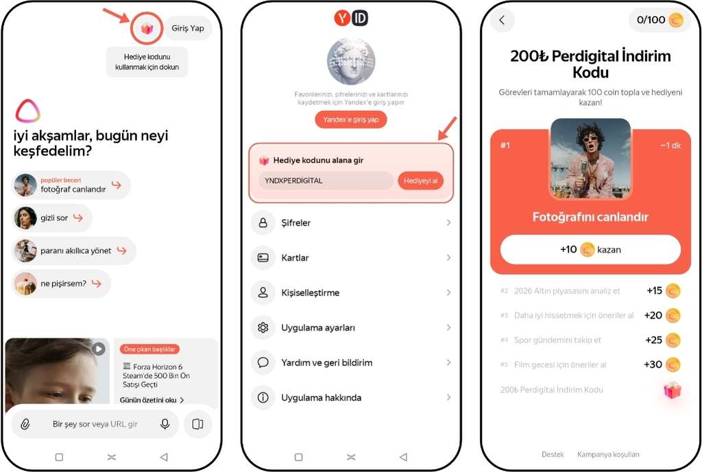 Tebrikler görevleri başarıyla tamamladınız! 500 TL ve üzeri alışverişlerde geçerli 200 TL değerindeki Perdigital İndirim Kodunuz ekranda gösterilecektir. Yandex AI uygulamasındaki görevlerin tamamlanmasıyla ilgili tüm detaylara buradan (4. KATILIM SÜRECİ başlığından) ulaşabilirsiniz.